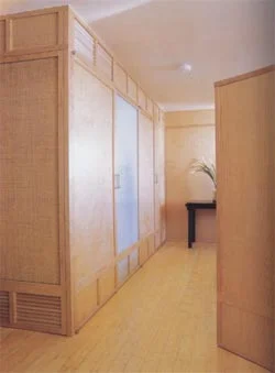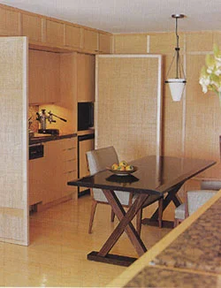 Because the Stones are not serious cooks, all they wanted were the bare necessities. A wall kitchen was hidden behind broad doors paneled in pale woven raffia. Fling them open and there it all is: granite counter tops , microwave / convection oven, under counter refrigerator, doll-size dishwasher and full-size espresso machine. Close the paneled doors, and all that is left is an elegant, subtly patterned wall. The raffia paneling continues around the dining area, covering the doorway and hiding mechanical systems.