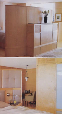 In the rest of the space, the walls were paneled in maple, "chosen because it came the closest to the bamboo we used on the floors", says Menendez. He established a geometric wall pattern, large vertical panels juxtaposed against smaller horizontal ones, to create a subtle rhythm and a balance.
