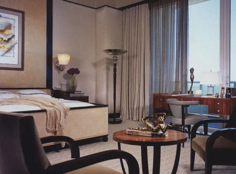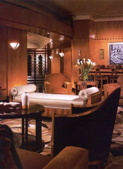 Meanwhile, Bill Taylor indulged his love of architectural history. He had to defy the existing architecture, whose worst flaw was the dearth of exterior walls. “The walls were all glass, protected by a white grid.” Says Taylor, who diverted attention with the same rich wood paneling used on the Normandie. In fact, the ship’s Grand Salon, the largest and most lavish public space afloat when the ocean liner steamed into New York harbor in 1935, became the inspiration for the dramatic “fins” that enclose the dining room.
