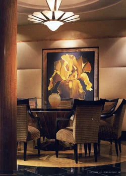 The stepped ceiling cove also marks a “streamlining of the elaborate details of the past century.” Says Taylor. The cove brings the tall penthouse ceilings into human scale, while adding the requisite dollop of glamour. The dining room’s circular plaster ceiling medallion also plays on the Deco geometry.