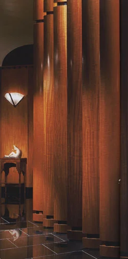 “ The ceiling was 40 feet tall, with artificial light flooding in over the columns from ceiling and wall fixtures,” Taylor says. “The fins that separate the dining room from the foyer, yet keep it open and light, serve to accentuate the verticality that is an element of Art Deco. The Normandie’s columns were finished the way my fins are, though I simplified that caps and bases.” Light washes down from a raised soffit, illuminating the anigre panels that were chosen for their subtly rich grain and then meticulously matched.