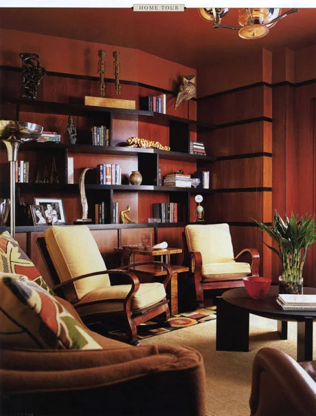 The streamlined ziggurats, another signature motif of that era, add interest to walls “that had very few right angles,” says Bill Taylor. “We had to bring some convention to an unconventional plan.” The ziggurat makes useful appearances in the master bedroom, with its parchment grid inspired by Jean-Michael Frank, and in the cherry-paneled library, with its collection of African tribal art.